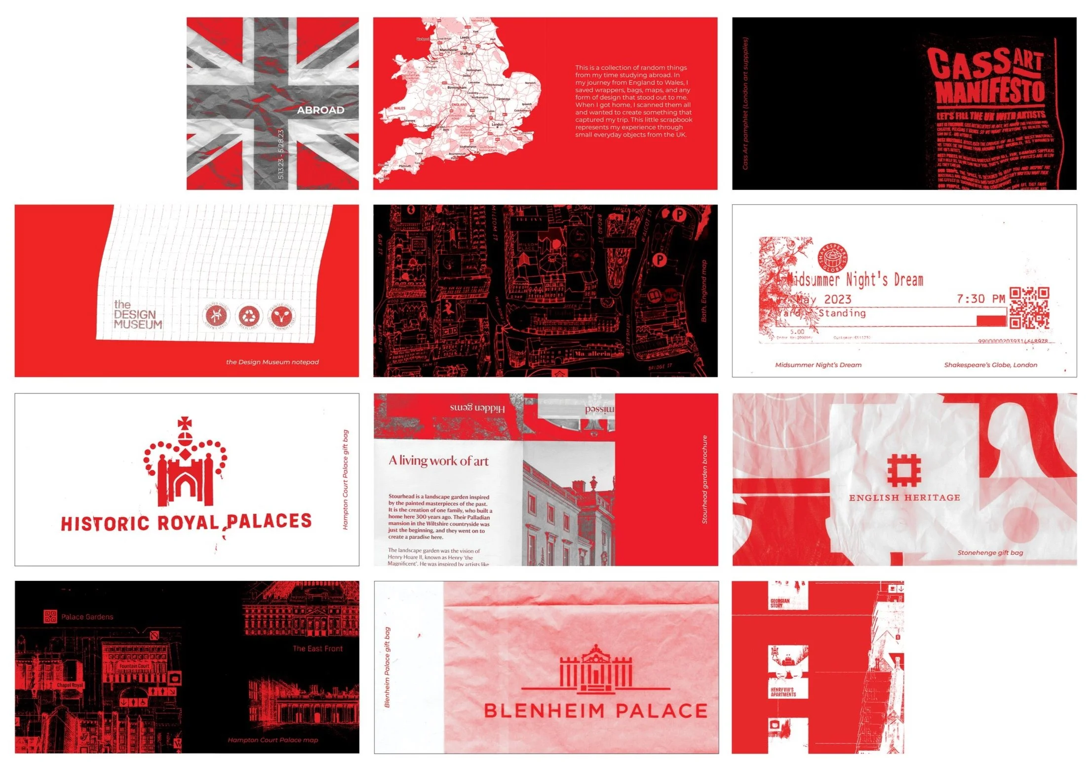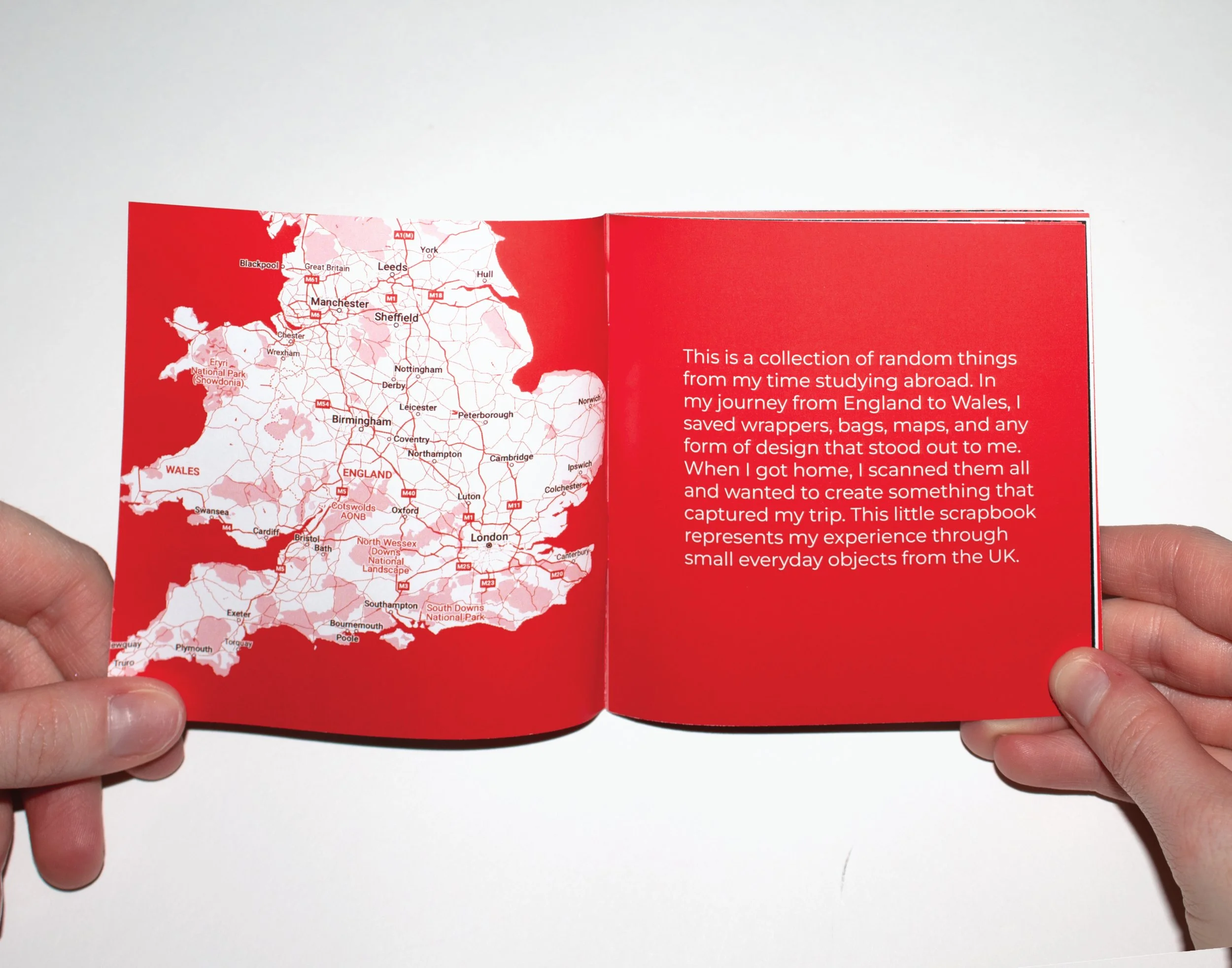 This project is a collection of pieces from my time studying abroad in England and Wales. While taking inspiration from their design styles, I collected little things and papers and scanned them when I got back. These materials include maps, wrappers, bags, and more. I chose the colors red and blue because those are the colors I noticed the most within their designs, representing the immense pride that they have for their country. Through everyday items like paper gift bags and maps, I am able to create my own art by seeing the beauty in average items. At the same time, I am also highlighting little snapshots of the design elements that caught my eye when I was there.
